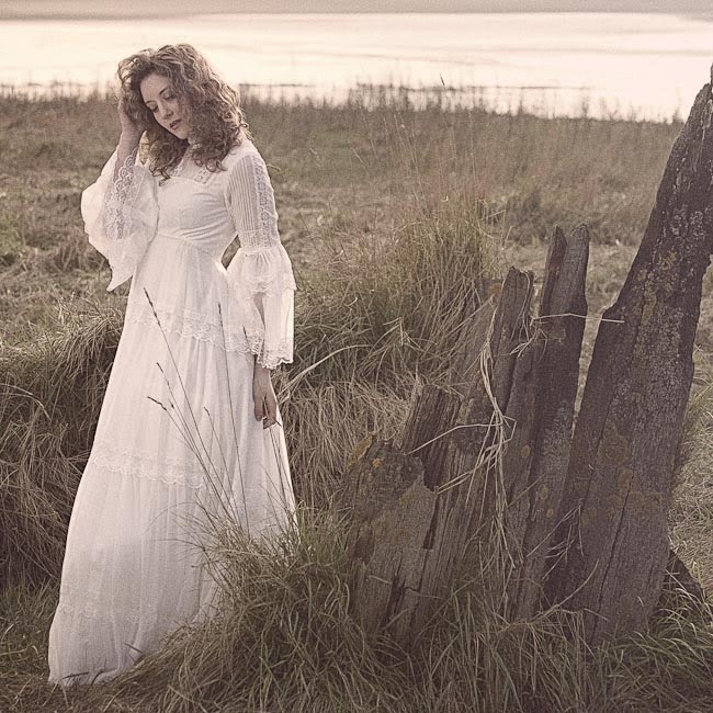 My Mum’s Victorian-style wedding dress, as worn in 1979 and brought to life with a dash of Florence and the Machine (Simon thinks) and Wuthering Heights (I think):