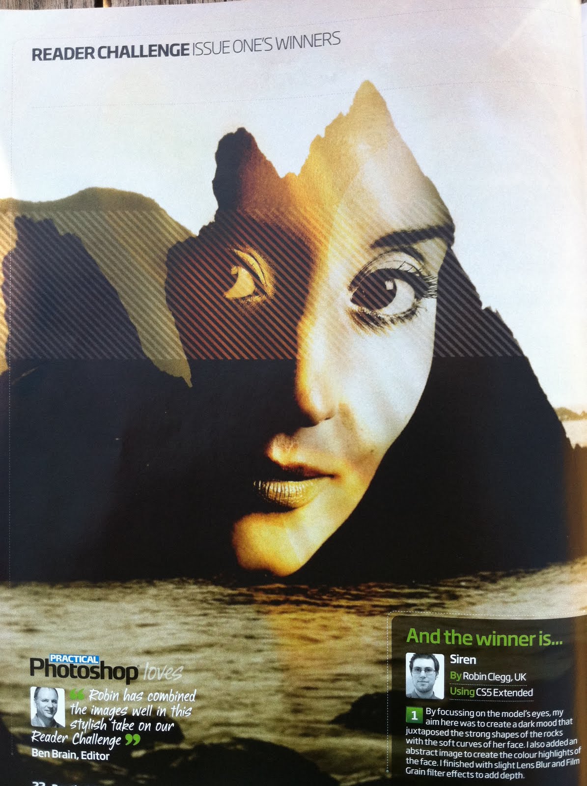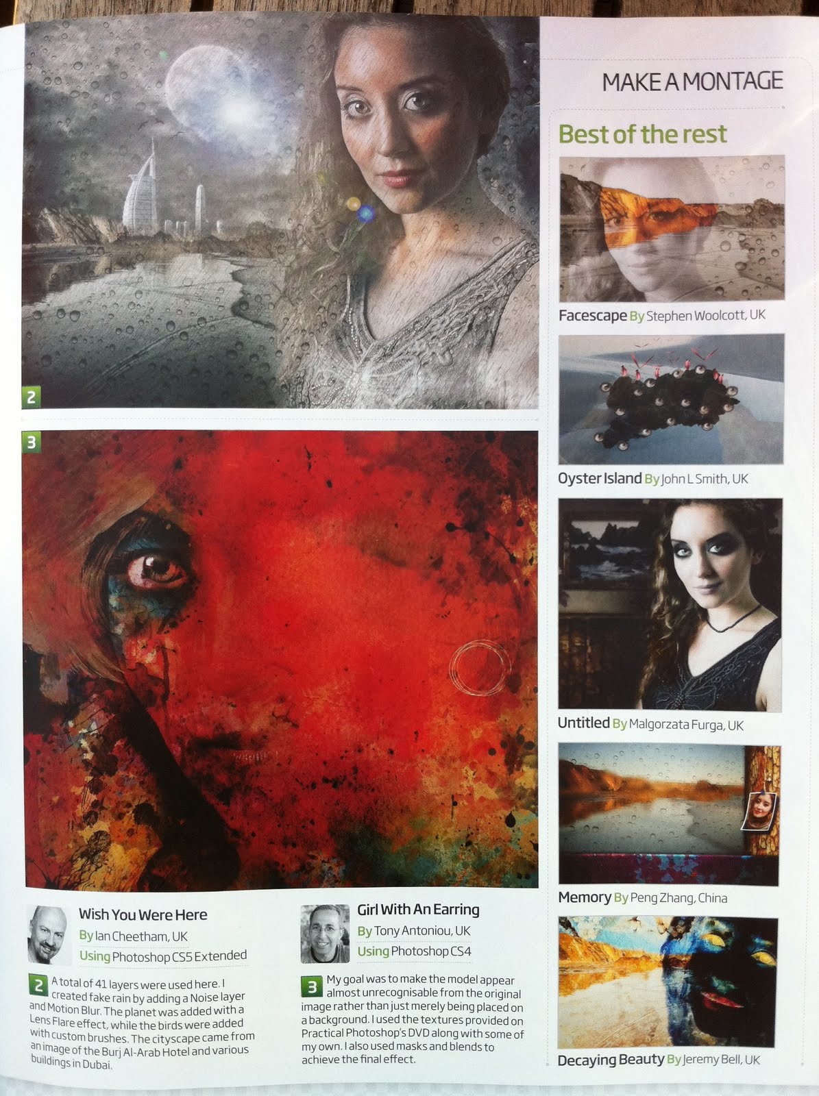 A photographer I worked with recently has kindly informed me that I’m in the current issue of Practical Photoshop. There are a few pages but my favourite feature is the one below, the results of a competition from the previous issue, in which readers were invited to create their own digital artworks using a portrait of me. It’s kinda strange to think that so many people I’ve never met were staring at my face in such detail and working on ideas for what they could do with it, and interesting to read some of the thoughts behind their work. Click to enlarge.