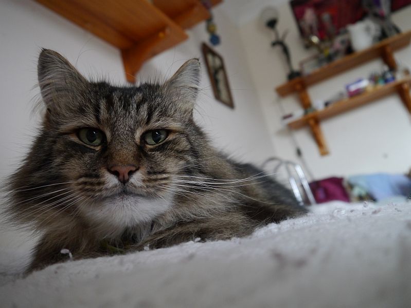 Well, I had to test out my new camera with a willing (lazy) subject, didn’t I? He has been following me around obsessively for the last few days, maintaining entire conversations with me around the subject of ‘Meeuugh’ and ‘Meeuh?’. He’s a rescue cat, and couldn’t purr for years (or perhaps he was hard to please and wanted us to earn the audible evidence of his pleasure), but now, I’m happy to say, he is an accomplished maker of the rumbling throat music. He also once tried to follow me into the bath (though changed his mind in mid-air and managed a sharp reverse). He’s cool. I love him a lot. Look at his lion face.