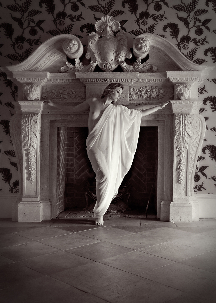 I love working with Trevor and Faye Yerbury – they produce such beautiful, classy work and are lots of fun to model for, so I was happy to be chosen to model for one of their Fine Art Nude Masterclasses the other day. As always, the photographers taking the course were all a pleasure to meet and seemed to enjoy themselves very much, snapping away with big smiles all round! The location was Pipewell Hall, an old country manor house in Northamptonshire. I was mainly stationed indoors with Faye, making the most of the building’s incredible features and furnishings, while the other model, Zoi, spent the day outdoors in the grounds with Trevor. It was really nice to meet Zoi after we’d tried but failed to meet up in Holland (where she is based most of the time, though she frequently visits the UK still) and we had a good natter over lunch. π We made a good contrast as photographic subjects; Zoi with her beautiful Greek/’Amazonian’ look and me with a more ‘pre-Raphaelite’/serene style (well, that’s what Trevor said anyway!).