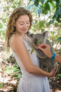 (Excuse the goofy/giddy expression.) After I mentioned that I’d really like to visit Lone Pine Koala Sanctuary a couple of days ago, when I arrived in Brisbane, the very lovely Cam Attree humoured me with a quick drive over and we had fun hanging out with kangaroos, looking at platypuses (platypi?), watching a brilliant birds of prey show, patting a dingo as it strolled around, and CUDDLING A KOALA. Basically I was in heaven. They have over a hundred koalas at the sanctuary, and coax them in turn from their 19-22 hours sleep per day to be cuddled by visitors, before depositing them gently back to their eucalyptus trees, where they fall asleep in the most unlikely positions. (See: http://www.buzzfeed.com/paws/awkward-cat-sleeping-positions?s=mobile for ideas)