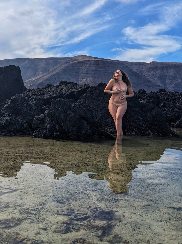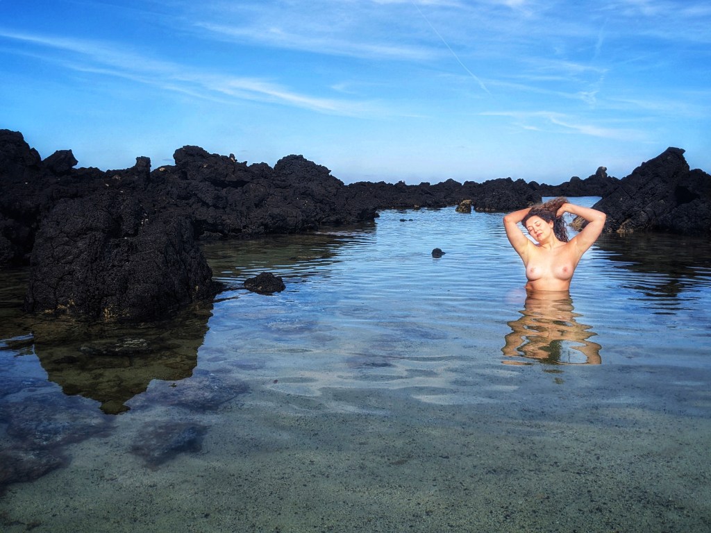 Modelling isn’t my ‘work’ anymore (and I always held that term loosely anyway, since I always did it for the love and fun of it – and the travel(!) – not just the money), so when the environment is right, and something in the air whispers to me to see what I can create with the elements of just my face, body and imagination…. And let’s face it, when you’re in a place with black rocks, volcanoes all around you, clear blue waters and also happen to be with someone who makes you feel like you’re the most beautiful person in the world… well, the clothes come off and artistic delight takes over.