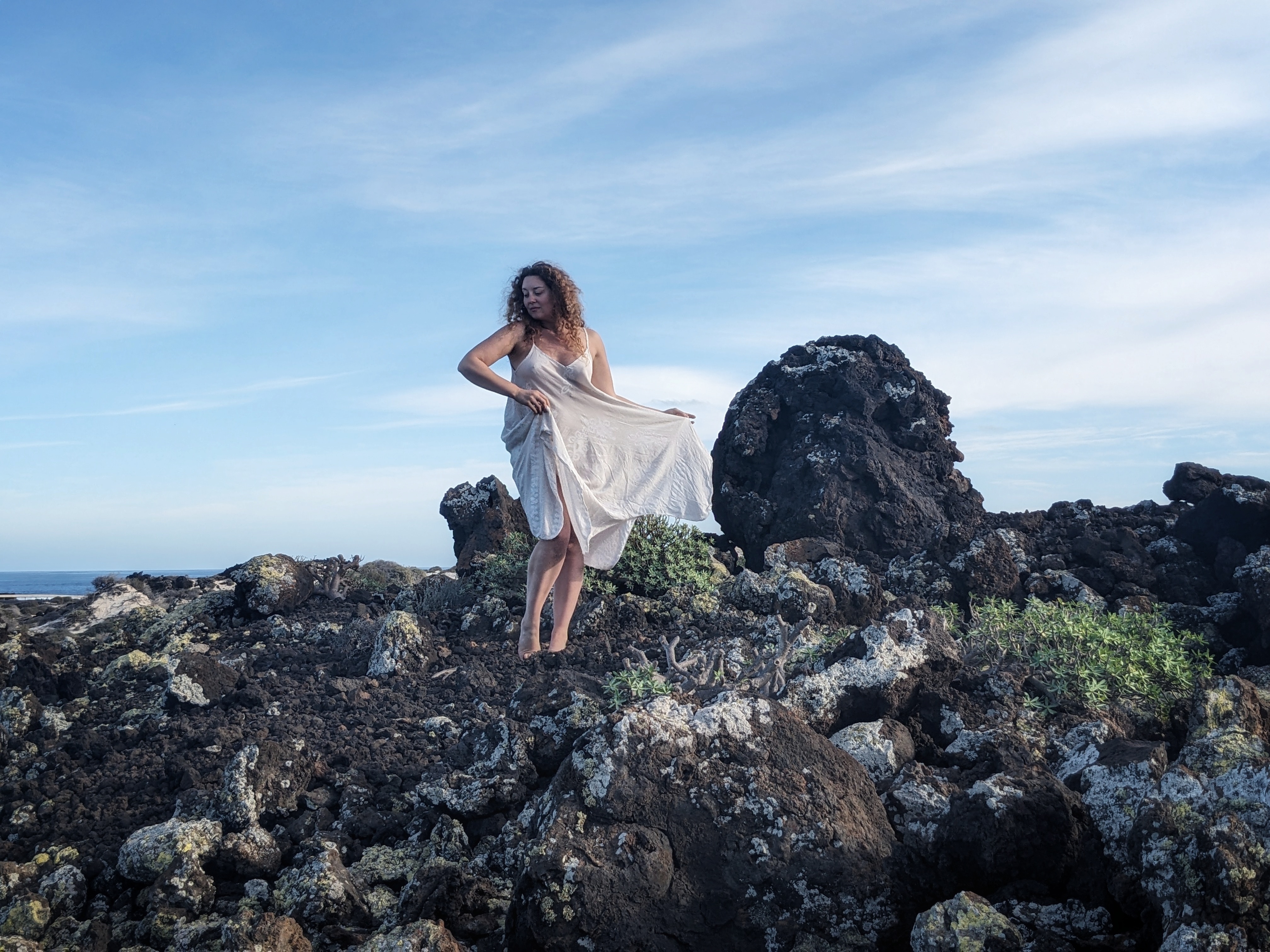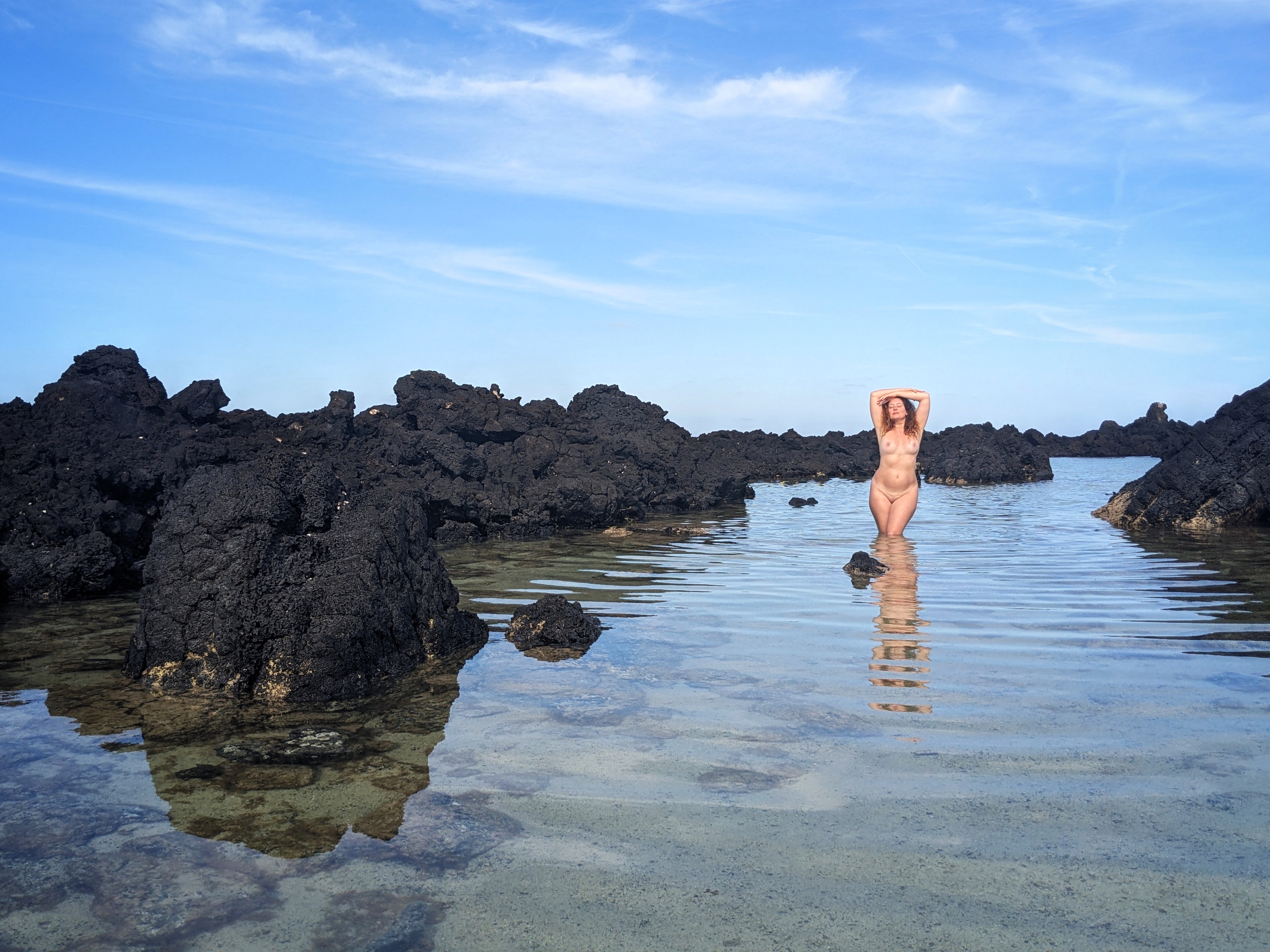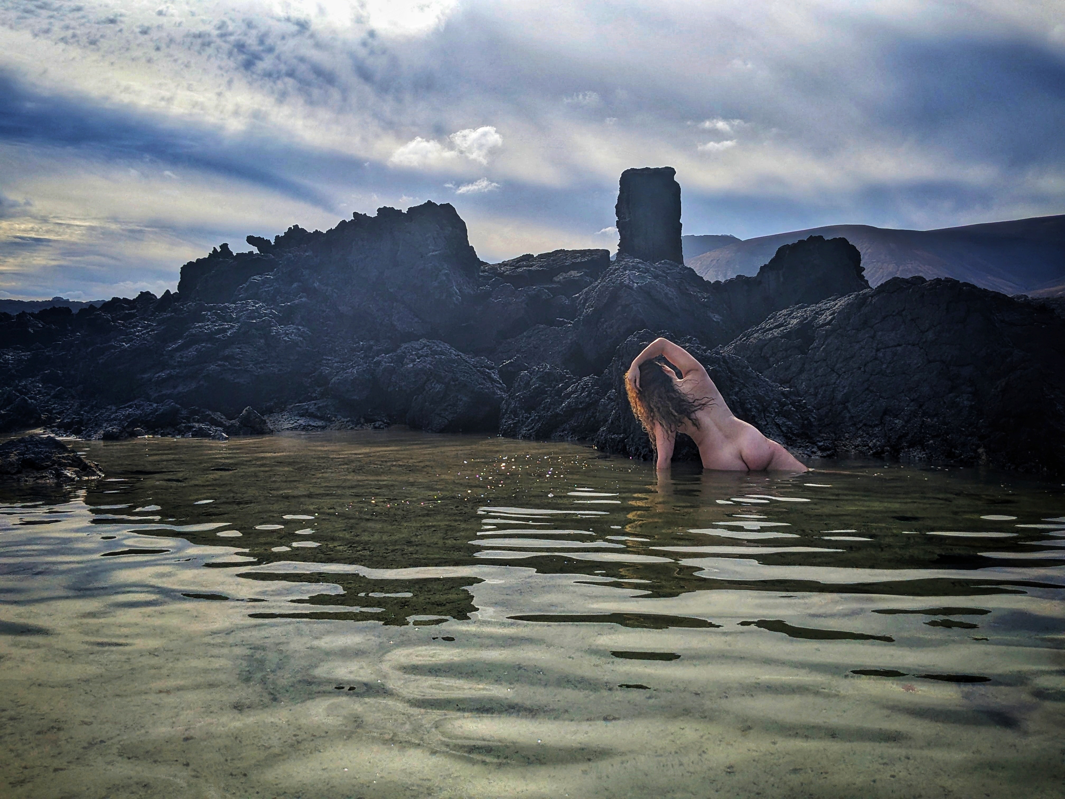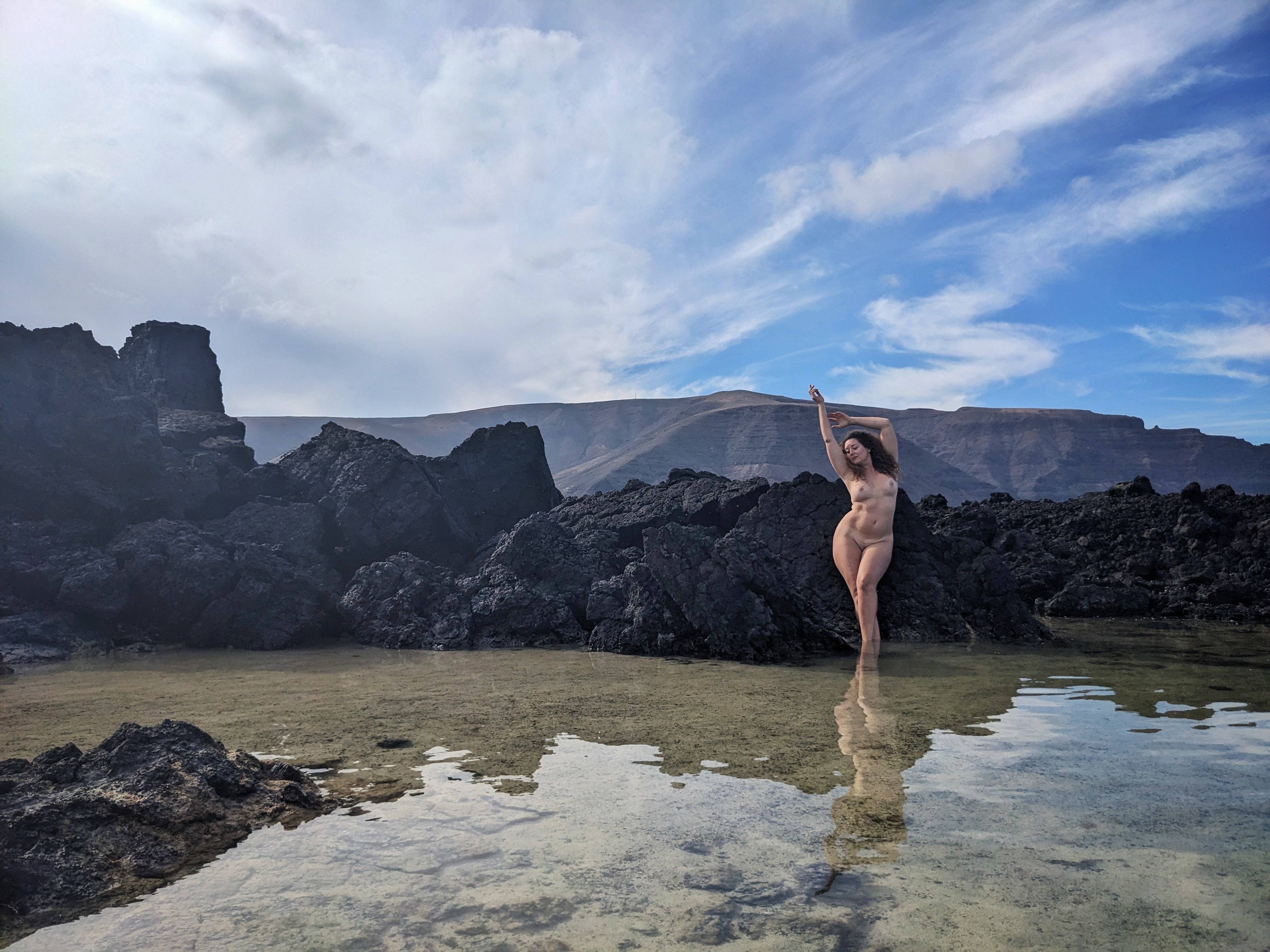 Modelling isn’t my ‘work’ anymore (and I always held that term loosely anyway, since I always did it for the love and fun of it – and the travel(!) – not just the money), so when the environment is right, and something in the air whispers to me to see what I can create with the elements of just my face, body and imagination…. And let’s face it, when you’re in a place with black rocks, volcanoes all around you, clear blue waters and also happen to be with someone who makes you feel like you’re the most beautiful person in the world… well, the clothes come off and artistic delight takes over.