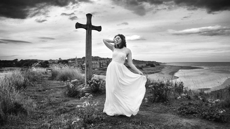 J found this beautiful location in Sussex and I had the immediate idea that I should lie down for this first close-in, abstract crop – I have no idea why, it just felt obvious when I saw the frame of the long grass in the foreground and water behind; and J got it pretty much how I’d imagined, if not better, with a slightly voyeuristic hint and beautiful focus – I love the three little dots of bokeh in the diagonal line as well! Then J played around with some reflections as I sat/stood/lay on the little wooden jetties that surrounded the lake. To finish, we did a little ‘Gaia’ set in the nearby field. We don’t often do portraits so thought it would be a good idea, then finished with some explosive hair, naturally.