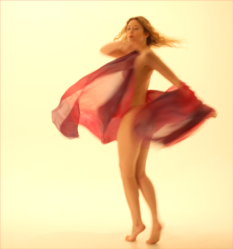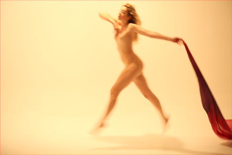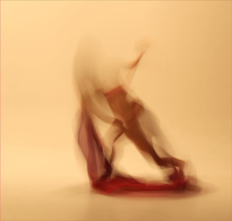 I love images which show movement blur – to be honest I’ve never been a huge fan of the ‘stop motion’ school of photography. I much prefer to move around like a mad thing and hope some kind of shutter release makes some kind of cool ghostliness happen. The following (very experimental) images were taken as part of the second shoot I did with Keith Cooper at Cheltenham Film Studios. I think they’re really cool – I’m barely even in some of them, so they’re nice and ‘anonymous’. I love the bright freshness and vibrancy of the colours in the first few, then the muted, soft, pale hues in the second lot. The piece of silk fabric I’d brought along (hand-dyed from Cairo, dontchya know) looks a bit like flames, flying up in sultry licks.